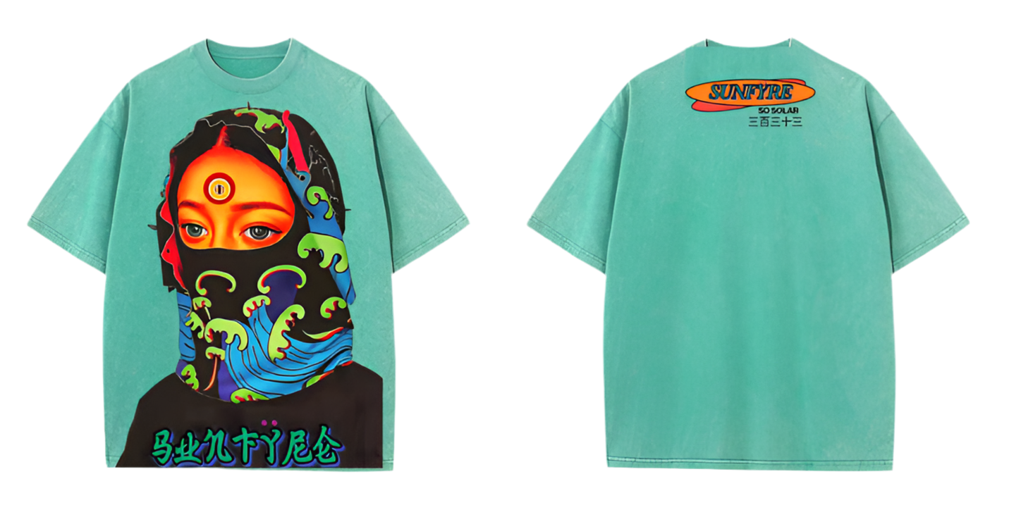The front of the shirt is dominated by a vivid, surrealist portrait of a veiled woman whose hypnotic gaze immediately commands attention. Her third eye , represented by the brands third eye logo ,centered on her forehead, symbolizes heightened awareness, spiritual insight, and enlightenment. It evokes themes of inner vision and intuition, tying into mysticism and deeper consciousness.